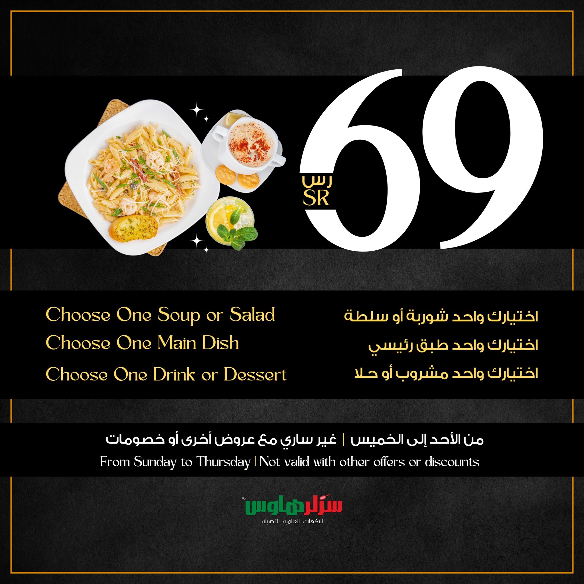 اختيارك من 1 شوربة أو سلطة + اختيارك من 1 طبق رئيسي + اختيارك من 1 مشروب أو حلا بـ 69 ريال بسسس!