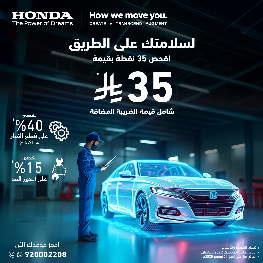 لسلامتك على الطريق، افحص مركبتك الآن 35 نقطة بـ 35 ريال فقط شامل قيمة الضريبة المضافة!