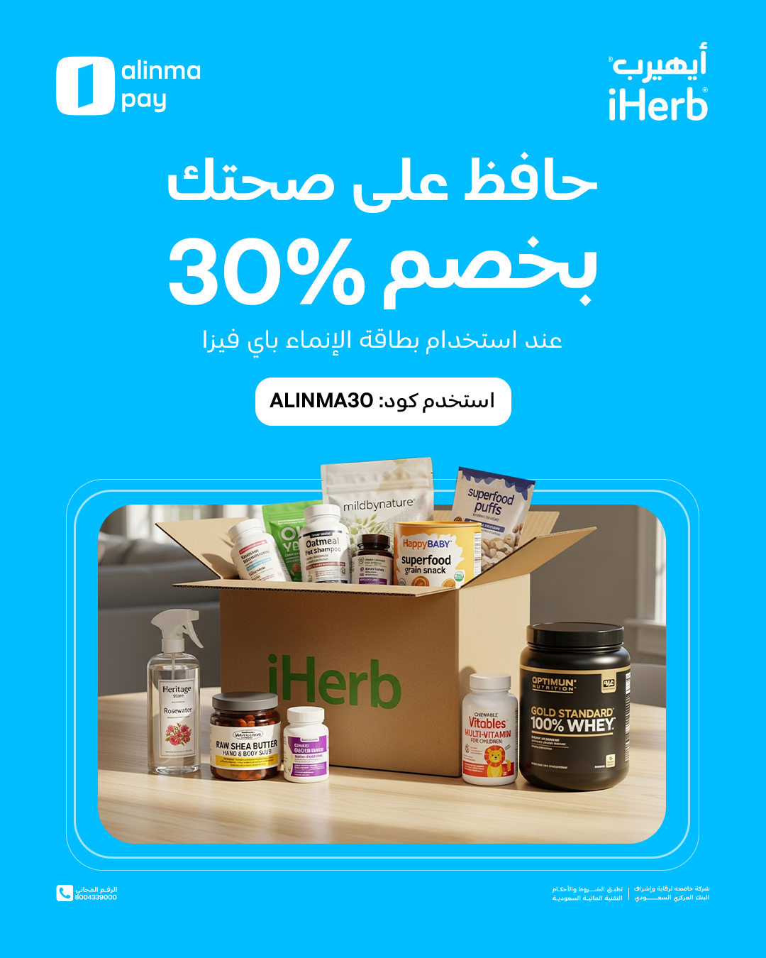 خصم 30% على مشترياتك من iHerb عند استخدام بطاقات الإنماء باي الكاش باك البلاتينيوم أو السجنتشر فقط!