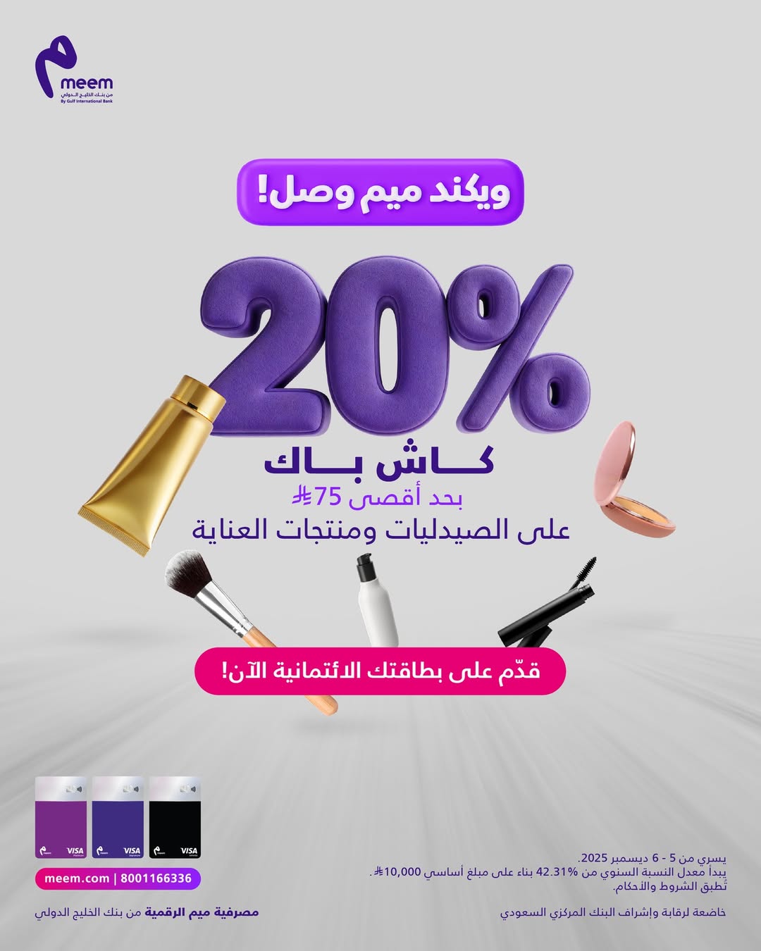 استمتع بـ 20% كاش باك على مشترياتك من الصيدليات ومنتجات العناية عند الدفع ببطاقتك الائتمانية من ميم!
