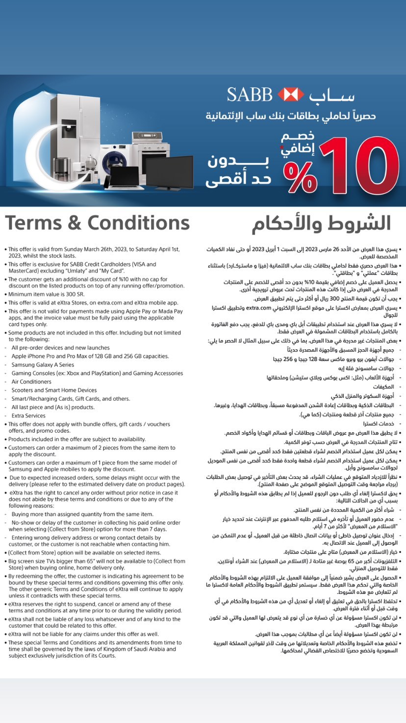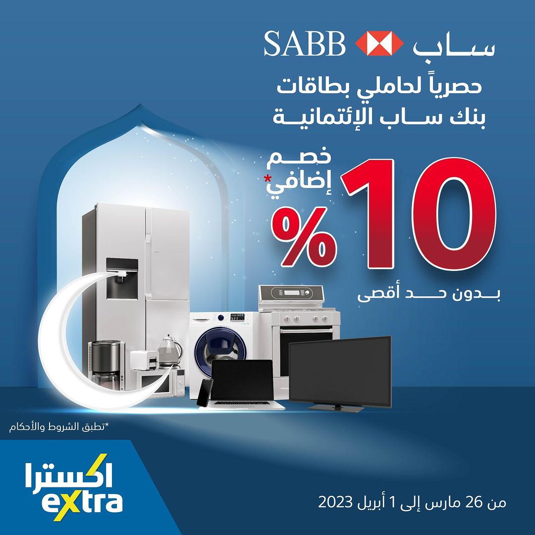 عرض اكسترا حصرياً لحاملي بطاقات بنك ساب الائتمانية.. تمتع بخصم إضافي 10% بدون حد أقصى على منتجاتك المفضلة حتى إذا كان المنتج تحت عروض ترويجية أخرى! يسري العرض بجميع معارضنا حول المملكة وعلى الموقع حتى 1 أبريل 2023! للمزيد من خلال الرابط التالي