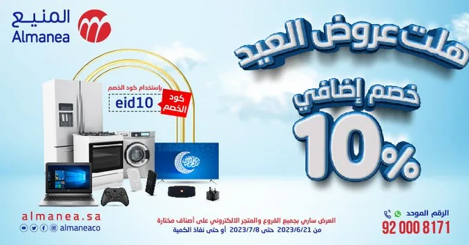 عروض العيد من المنيع خصم إضافي 10% بإستخدام كود الخصم eid10 العرض ساري على أصناف مختارة حتى 8/7/2023 أو حتى نفاذ الكمية تفضلوا بزيارة أحد الفروع أو المتجر الإلكتروني أو بالاتصال على الرقم الموحد 920008171 لمتابعة بقية العروض أنتقل للصفحة التالية