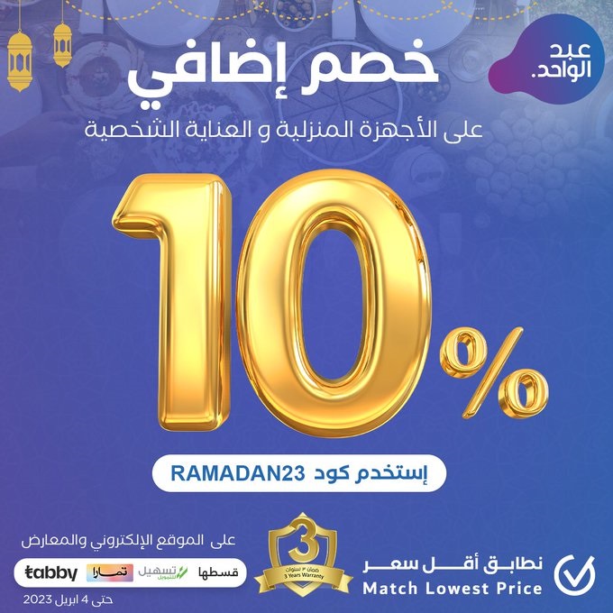 عرض شركة أحمد عبدالواحد التجارية الآن فرصتكم للاستفادة من خصم 10% إضافي على الأجهزة المنزلية والعناية الشخصية باستخدام كود الخصم: RAMADAN23 *يستمر العرض حتى 4 أبريل.. ماذا تنتظرون؟ للتسوق من خلال الرابط التالي