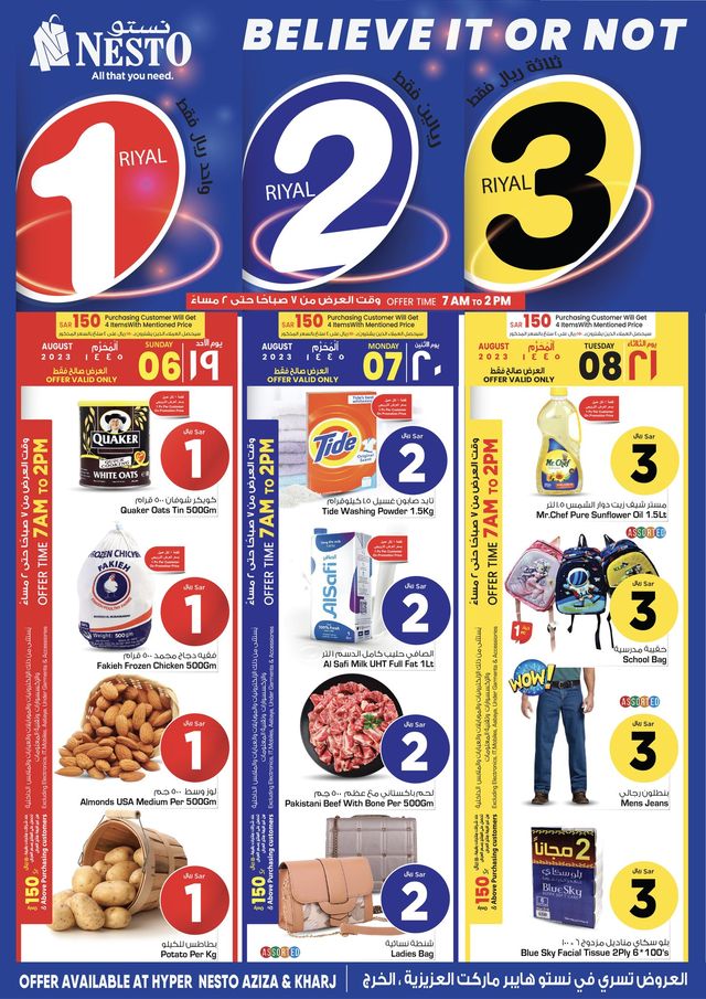 عروض هايبر نستو الرياض الخرج لـ 3 أيام فقط لا يفوتك عرض نستو الكبير 1-2-3 ريال في العزيزية & الخرج.. عروض لا تصدق على كل ريال! سارية من 6 - 8 أغسطس 2023 لمتابعة بقية العروض أنتقل للصفحة التالية لمتابعة بقية العروض أنتقل للصفحة التالية