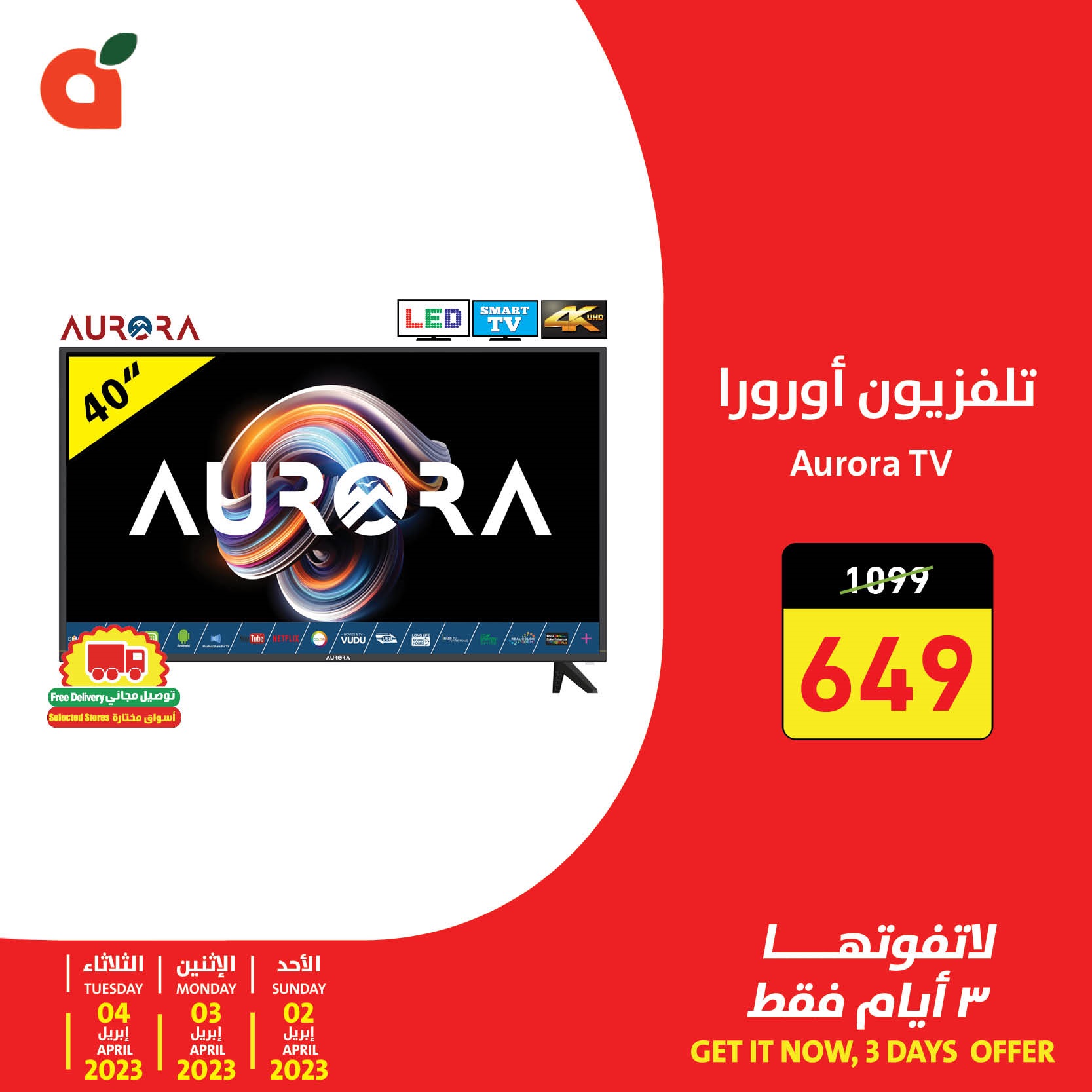 عروض الشاشات من أسواق هايبر بندة عرض حصري لفترة محدودة على تلفزيون أورورا لاتفوتوا عروض بنده الحصرية.. زورونا في فروع بنده وهايبربنده. يسري العرض من تاريخ 2 إبريل إلى 4 إبريل 2023م أو حتى نفاذ الكمية