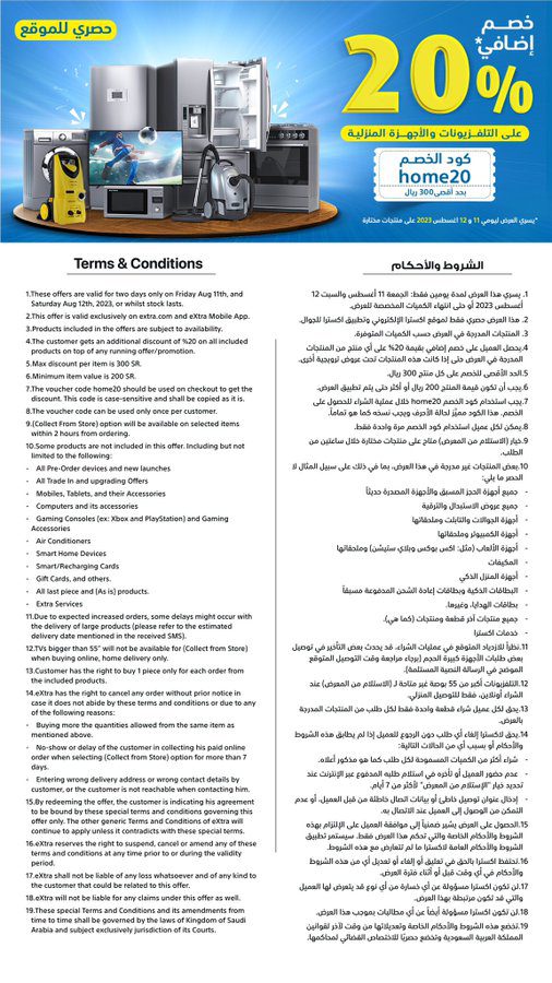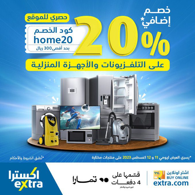 عرض اكسترا السبت فقط عرض حصري للموقع حتى 12 أغسطس 2023 فقط .. استخدم كود الخصم home20 واحصل على خصم إضافي 20% على التلفزيونات والأجهزة المنزلية حتى إذا كان المنتج تحت عروض ترويجية أخرى! قسّم فاتورتك على 4 دفعات مع تمارا *تطبق الشروط (الحد الأقصى للخصم 300 ريال للمنتج). للمزيد من خلال الرابط التالي