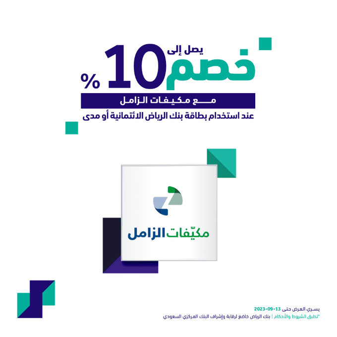 عرض مكيفات الزامل استمتع بخصم %10 لدى مكيفات الزامل عند استخدام بطاقات بنك الرياض الائتمانية أو مدى يسري العرض حتى 2023/09/13 ■ العرض يسري عبر الموقع الالكتروني فقط ■ الرمز الترويجي: 10RYB ■ لا يمكن ال ُ جمع بين هذا العرض وبين أي عروض أو خصومات أو قسائم شراء، ما لم يذكر خلاف ذلك
