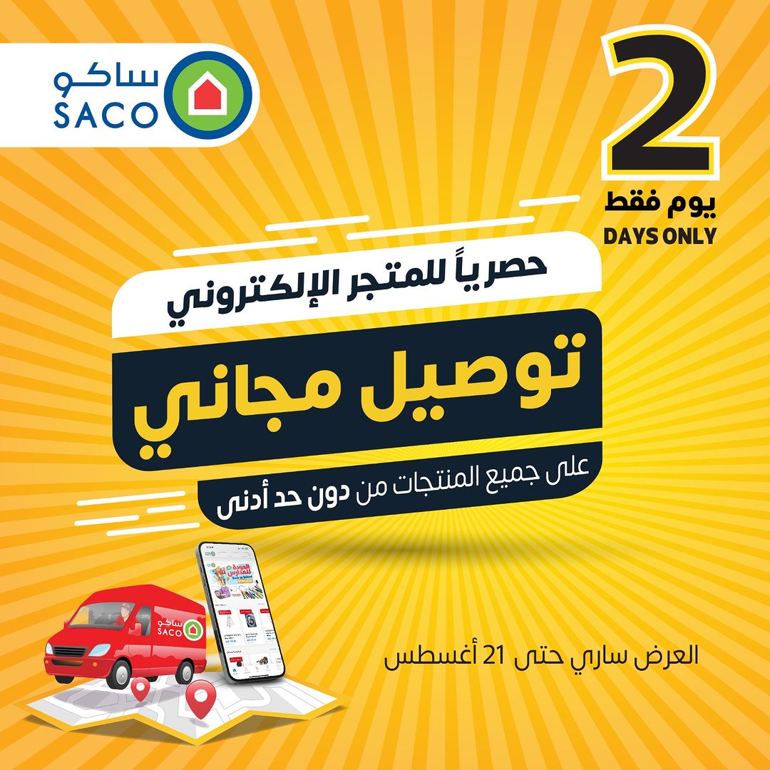 Exclusively for the online store.. Free delivery on everything and no minimum The offer is valid for two days only, until August 21st عرض ساكو حصرياً للمتجر الإلكتروني .. توصيل مجاااني على كل شيء وبدون حد أدنى العرض ساري لمدة يومين فقط حتى 21 أغسطس تسوّق الآن من خلال الرابط التالي