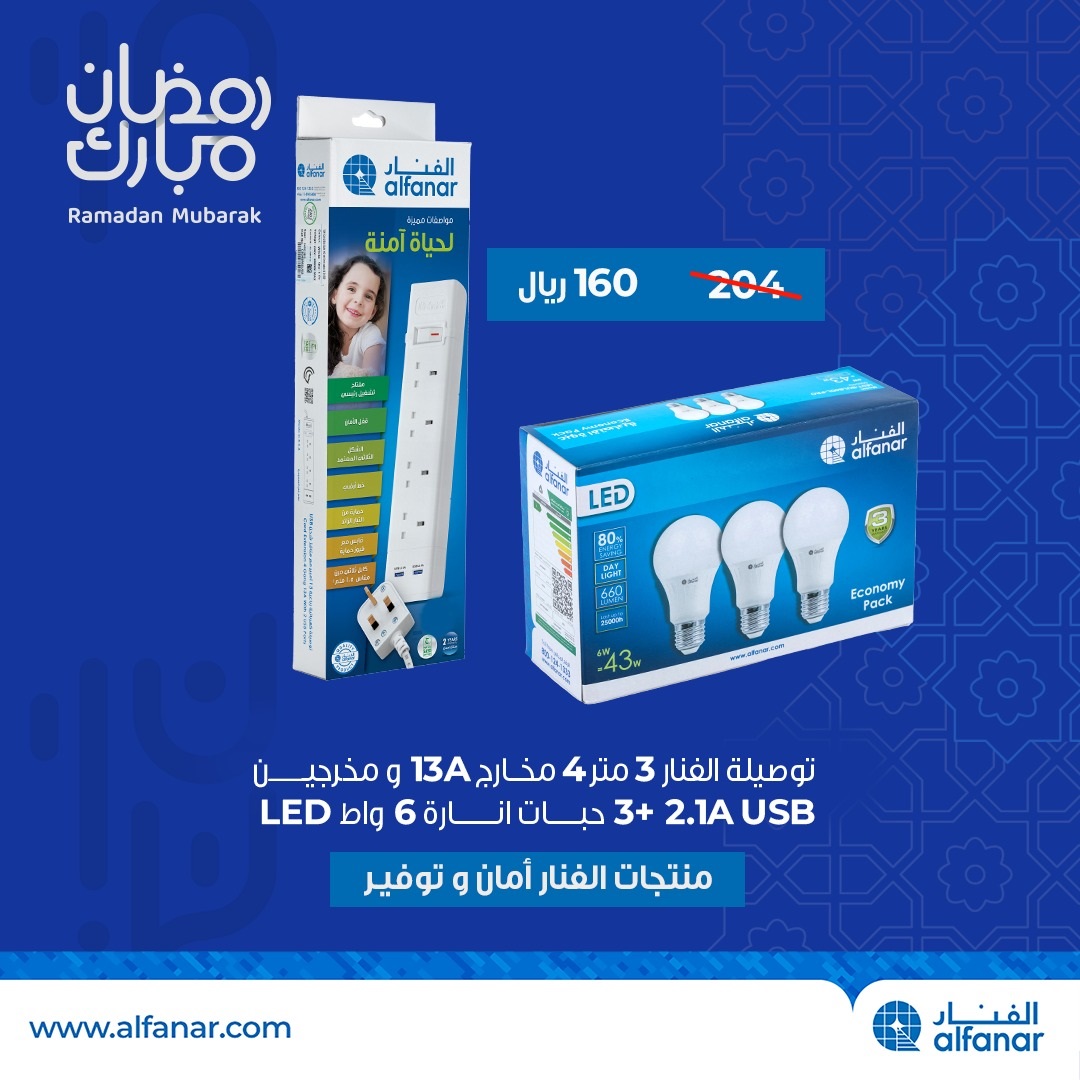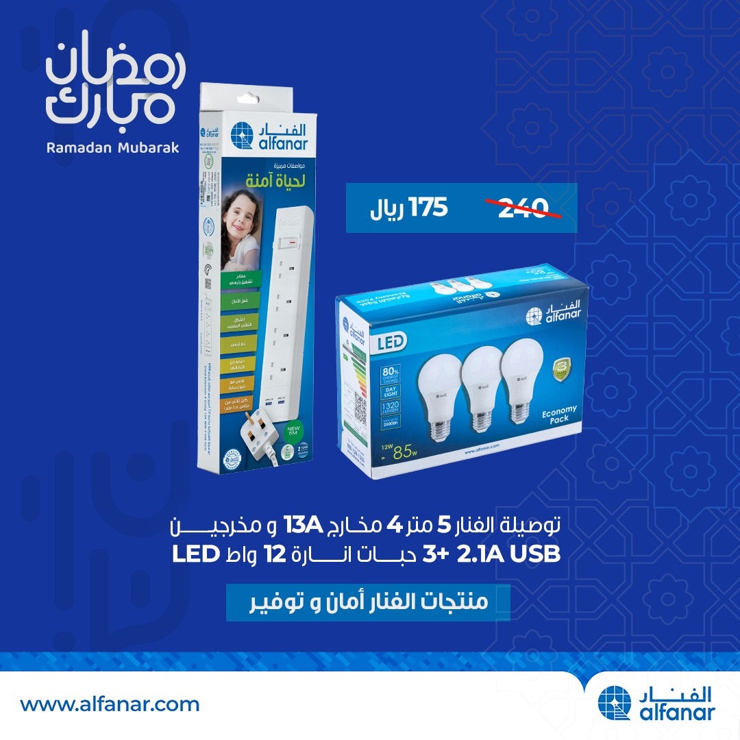 عرض شركة الفنار تبقى 4 أيام فقط! بادر الآن بالشراء قبل نهاية عرض رمضان لمنتجات لفنار لدى متاجر اكسترا السعودية و ساكو.. - لعرض 160ريال، تأكد من اضافة توصيلة الفنار 3متر + 3حبات إنارة 6 واط LED في السلة. - لعرض 175ريال، تأكد من اضافة توصيلة الفنار 5متر + 3حبات إنارة 12 واط LED في السلة.