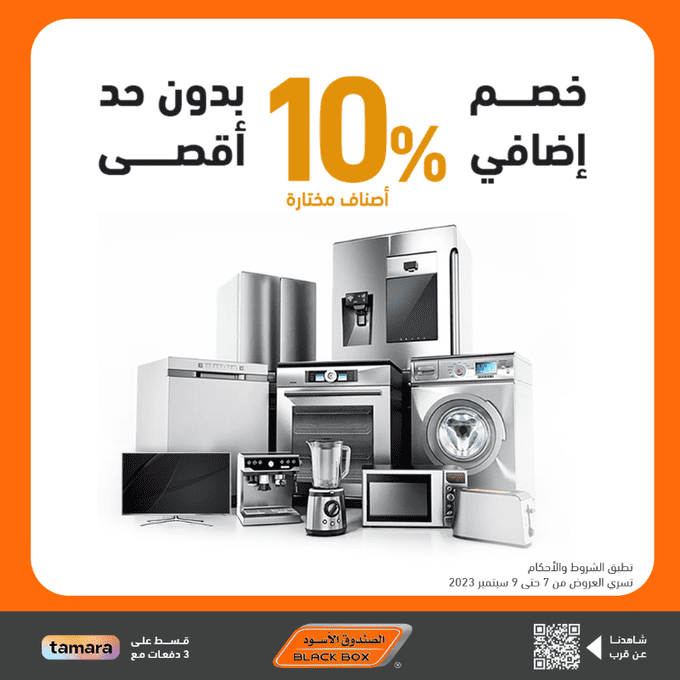 عرض نهاية الأسبوع من الصندوق الاسود وفرها فى الويك اند .. كاش باك 10% بدون حد أقصى على جميع الأقسام ماعدا المكيفات وعلى ماركات محددة للشاشات تسوق الان من خلال الرابط التالي * سارى من يوم 7 حتى يوم 9 سبتمير * تطبق الشروط والأحكام