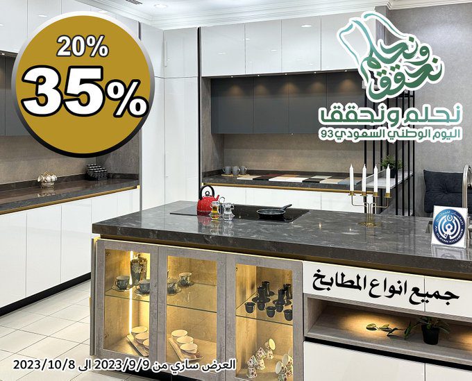 عرض اليوم الوطني من العليان للمطابخ بمناسبة اليوم الوطني السعودي الـ 93.. تخفيضات حتى 35% على جميع المطابخ العرض ساري حتى 8 أكتوبر 2023 للمزيد من خلال الرابط التالي