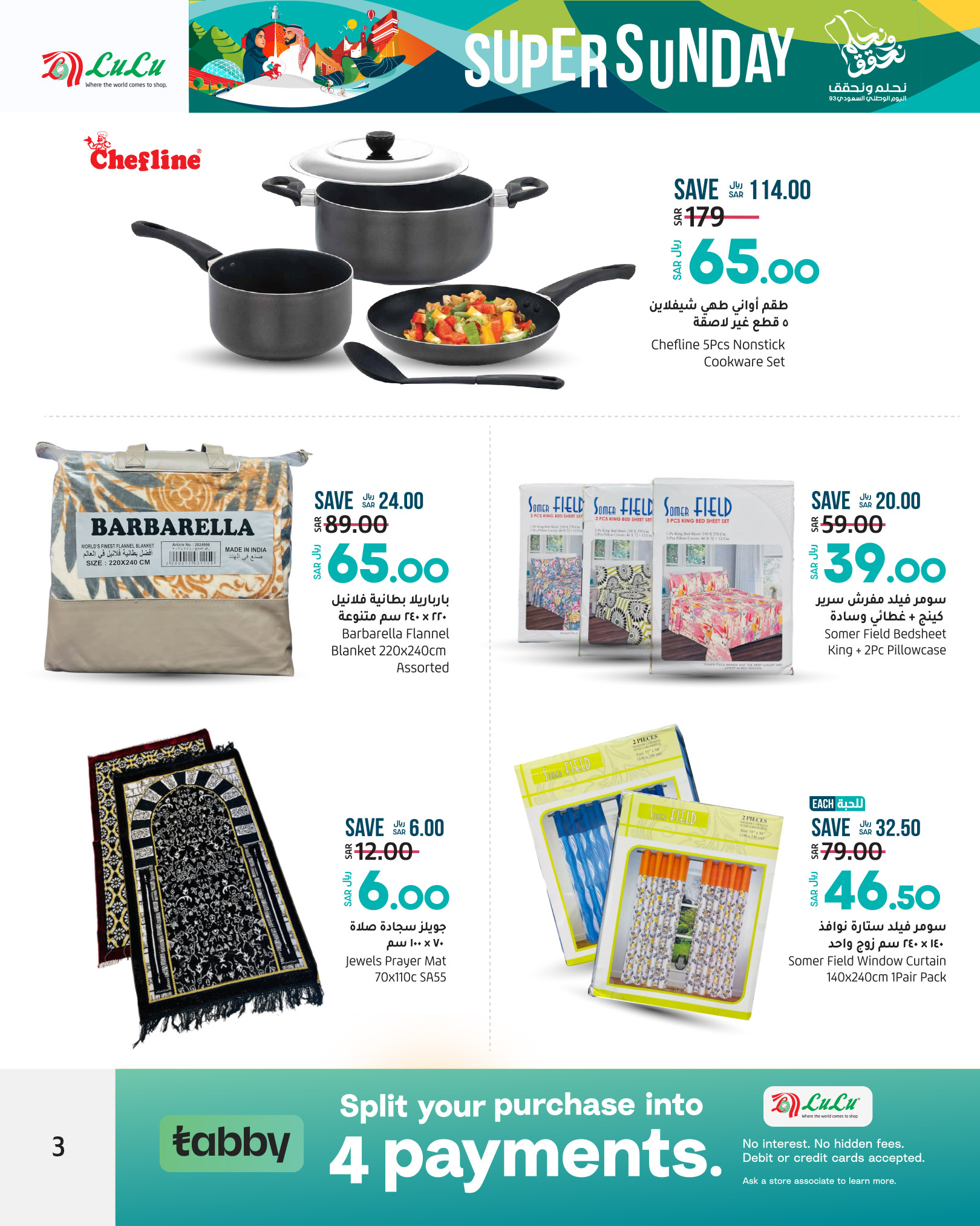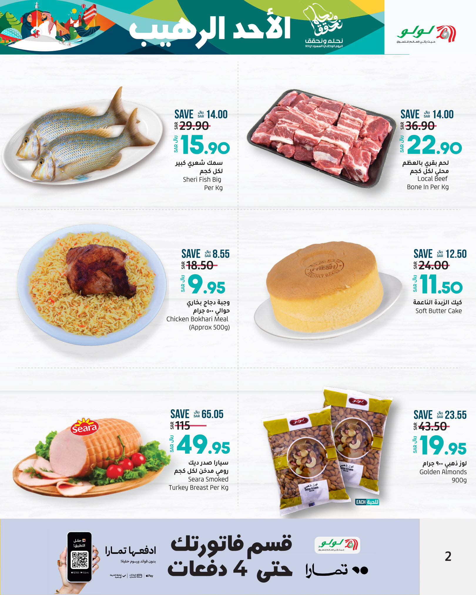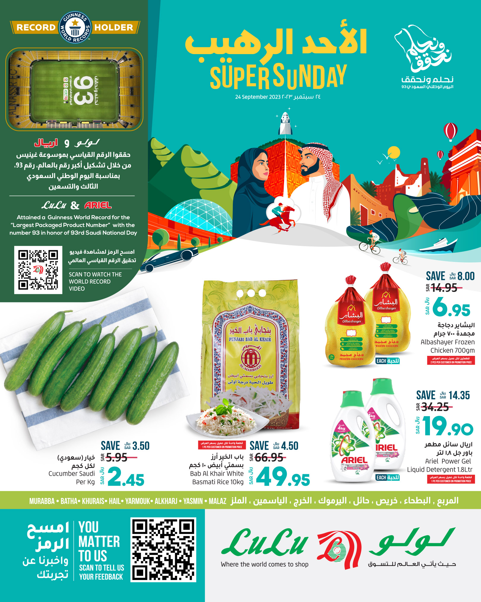 Get ready for Super Sunday! Join us these national days season, on 24th September at LuLuSA in Riyadh, Hail and Al Kharj stores for unbeatable offers on food, electronics, and more. Don't miss out - mark your calendars now! عروض اسواق لولو الرياض الخرج حائل الأحد فقط استعد للأحد المذهل! استمتع بعروض اليوم الوطني بتاريخ ٢٤ سبتمبر في لولو السعودية فروع الرياض و الخرج و حائل. عروض لا تقاوم على جميع الأقسام. لمتابعة بقية العروض أنتقل للصفحةا لتالية