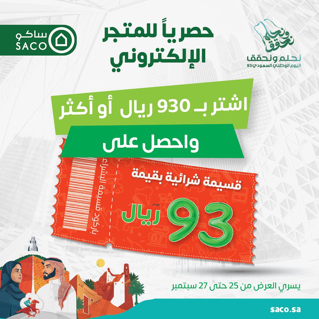 Exclusively for the online store.. Buy for 930 riyals or more and get a voucher worth 93 riyals The offer is valid until September 27th عرض ساكو الاربعاء فقط حصرياً للمتجر الإلكتروني .. اشتر بـ 930 ريال أو أكثر واحصل على قسيمة شرائية بقيمة 93 ريال العرض ساري حتى 27 سبتمبر للتسوق من خلال الرابط التالي