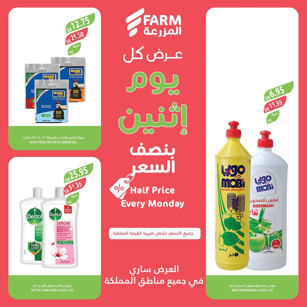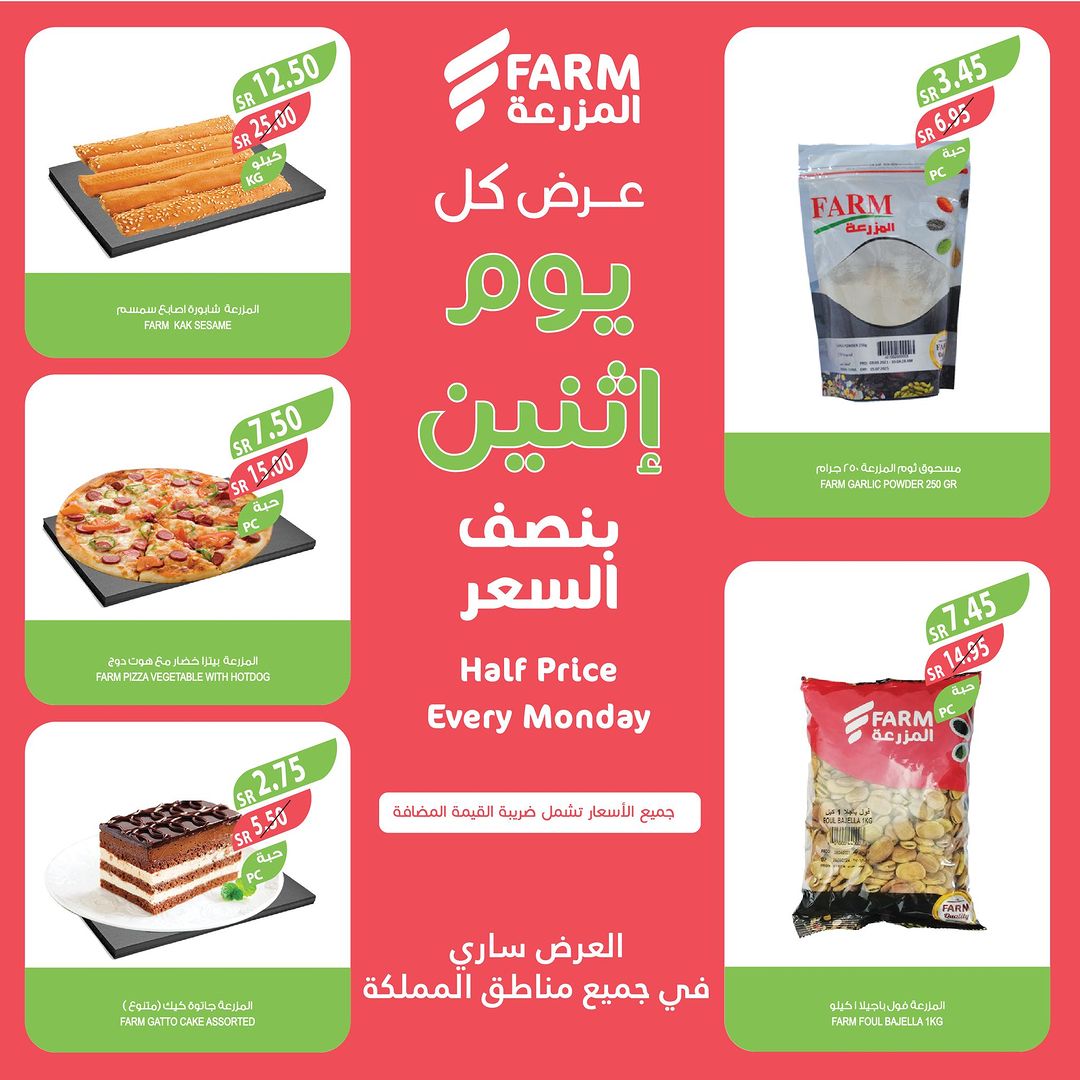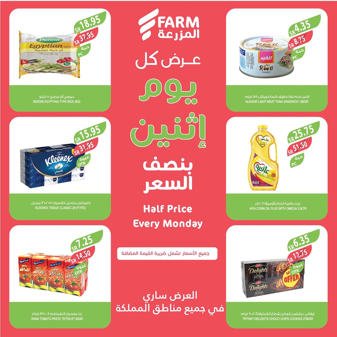 As usual Monday half price offers on variety quality items at FARM Offers are valid only on Monday, October 9, 2023 or while supplies last عروض الإثنين من اسواق المزرعة في المزرعة كما عودناكم عروض نصف السعر على منتجات بجودة عالية كل يوم اثنين سارية العروض فقط في الإثنين 9 أكتوبر 2023 أو حتى نفاذ الكمية لمتابعة بقية العروض أنتقل للصفحةا لتالية لمتابعة بقية العروض أنتقل للصفحةا لتالية