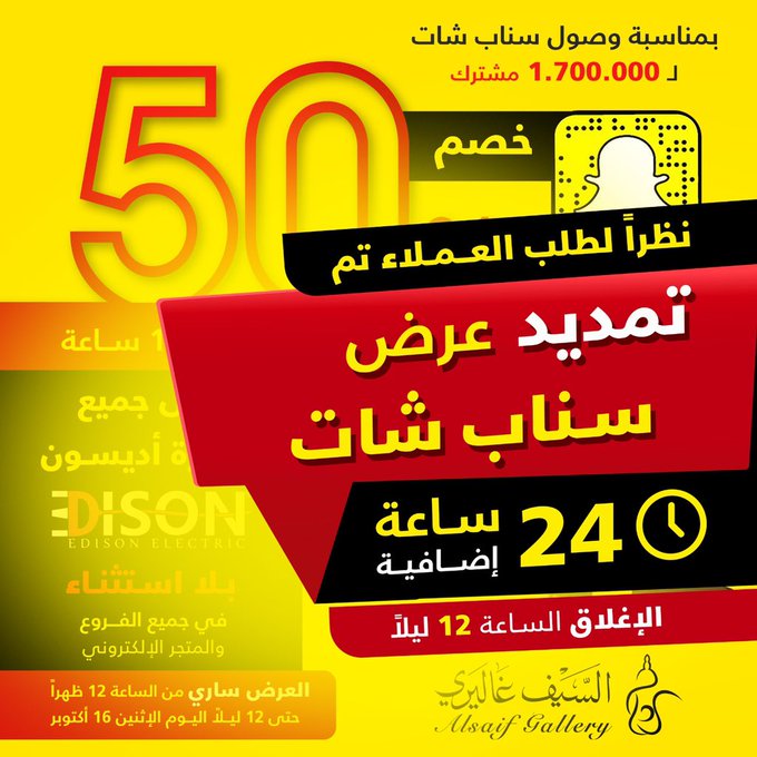 On the occasion of Al Saif Gallery’s Snapchat reaching 1,700,000 subscribers.. 50% discount on all Edison devices without exception The offer is valid in all branches and the application Only on Tuesday, October 17, 2023 عرض السيف غاليري الثلاثاء فقط بمناسبة وصول سناب السيف غاليري لـ 1.700.000 مشترك .. خصم 50% على جميع أجهزة إديسون بلا استثناء العرض ساري في جميع الفروع والتطبيق فقط في الثلاثاء 17 أكتوبر 2023