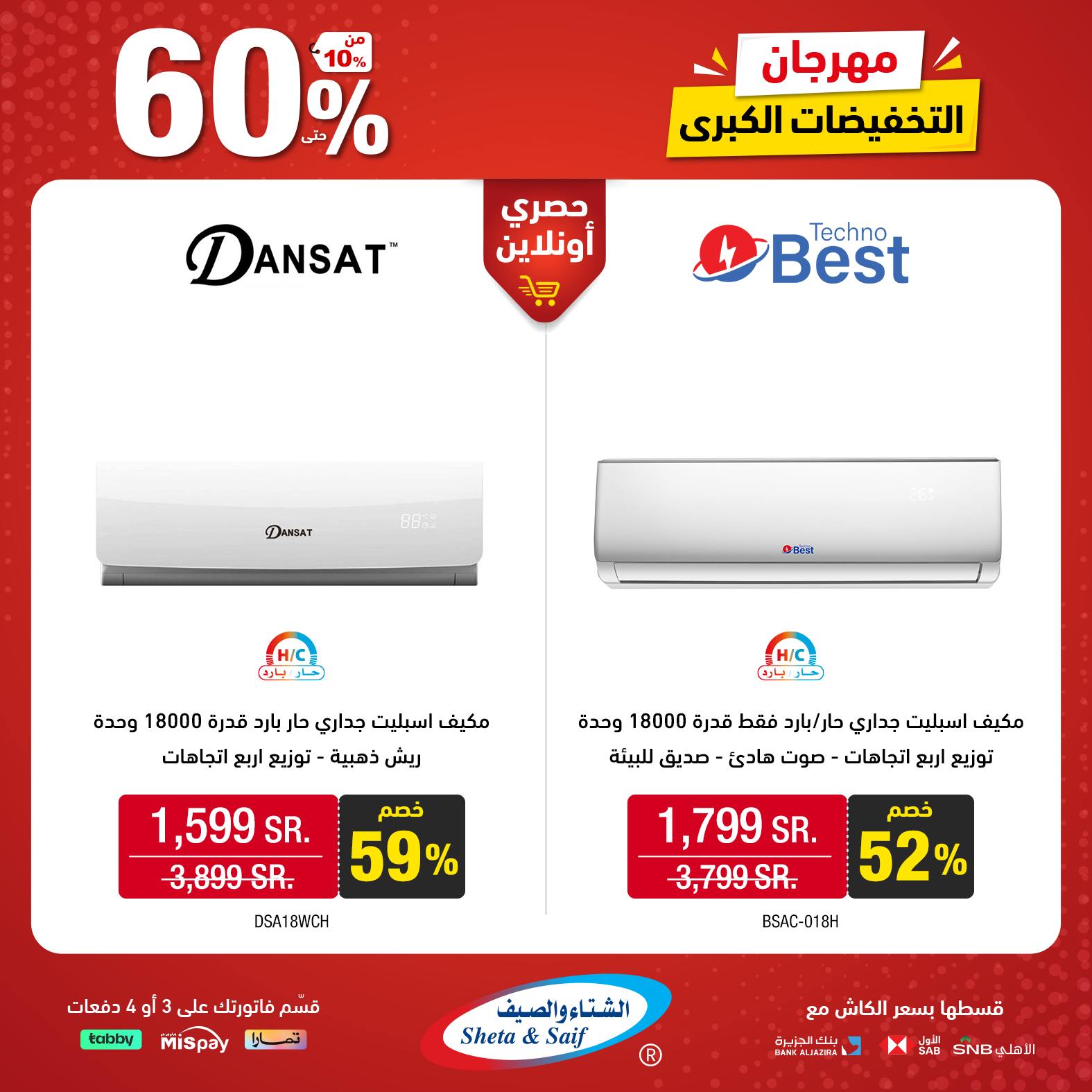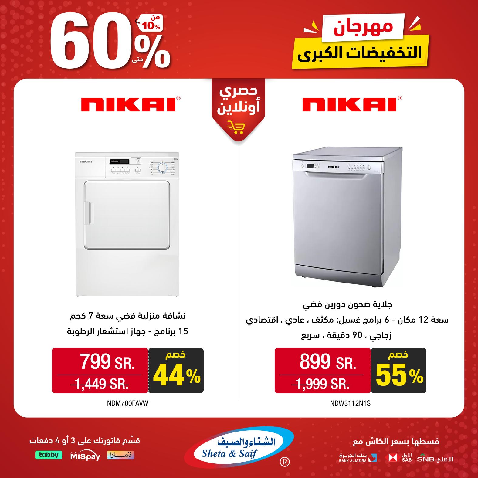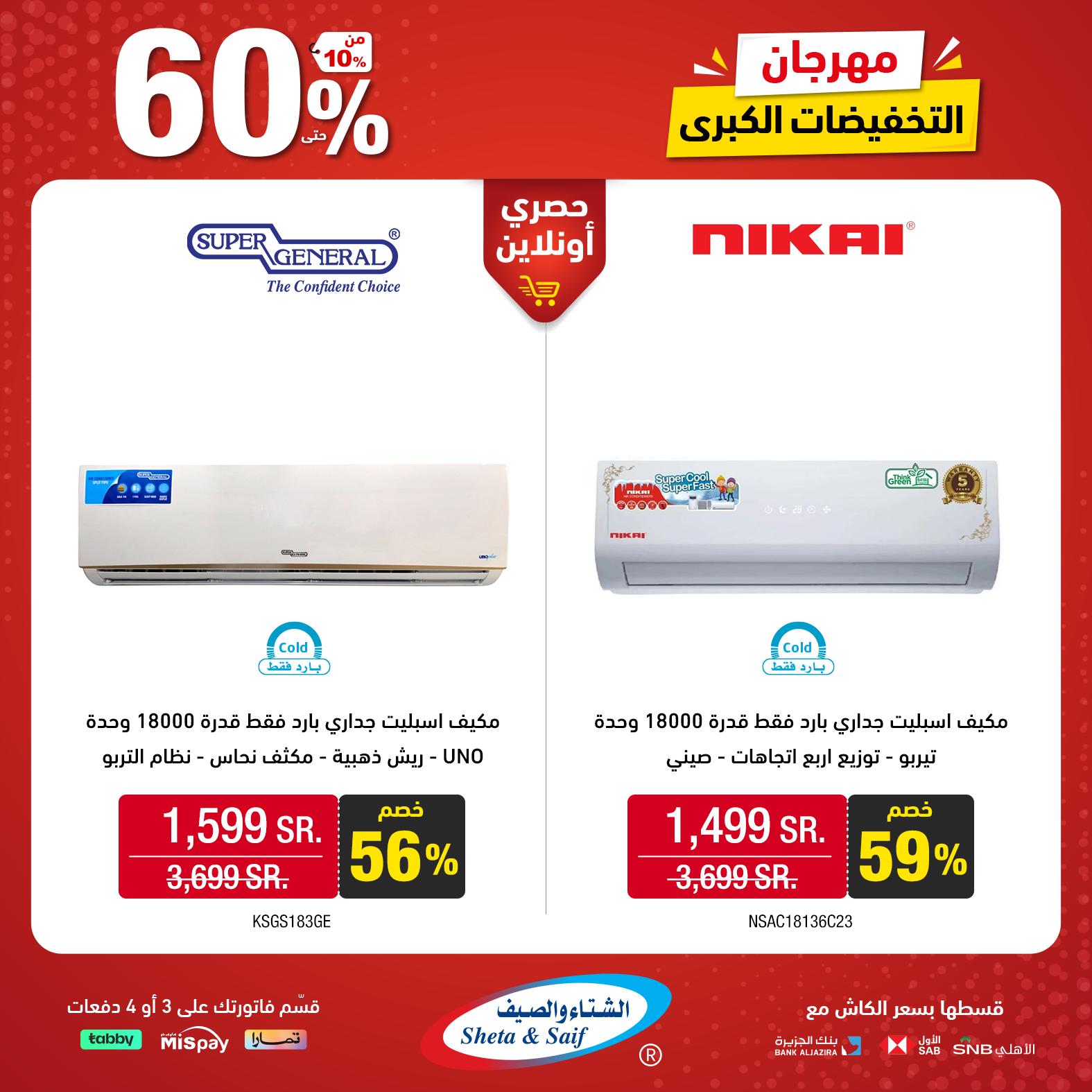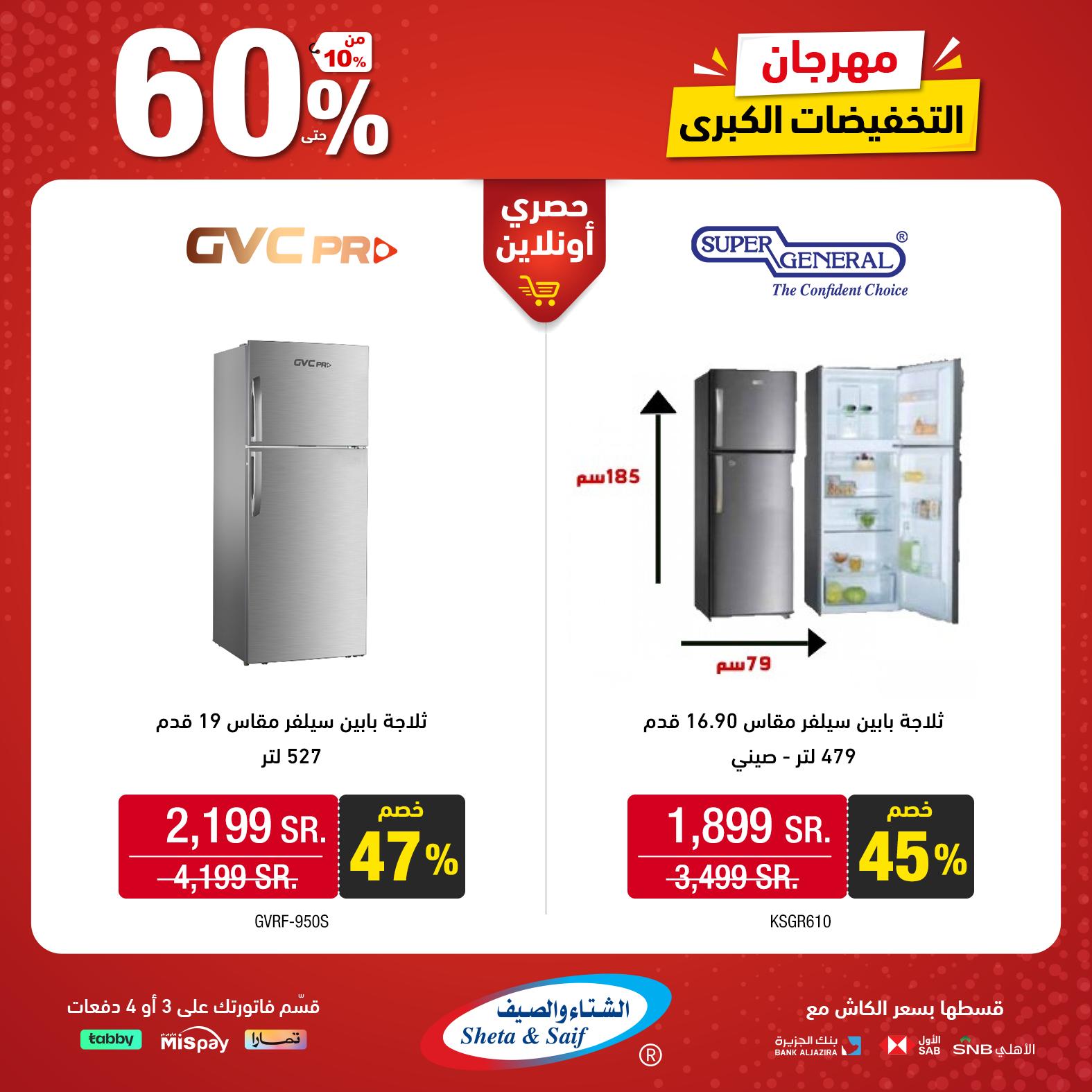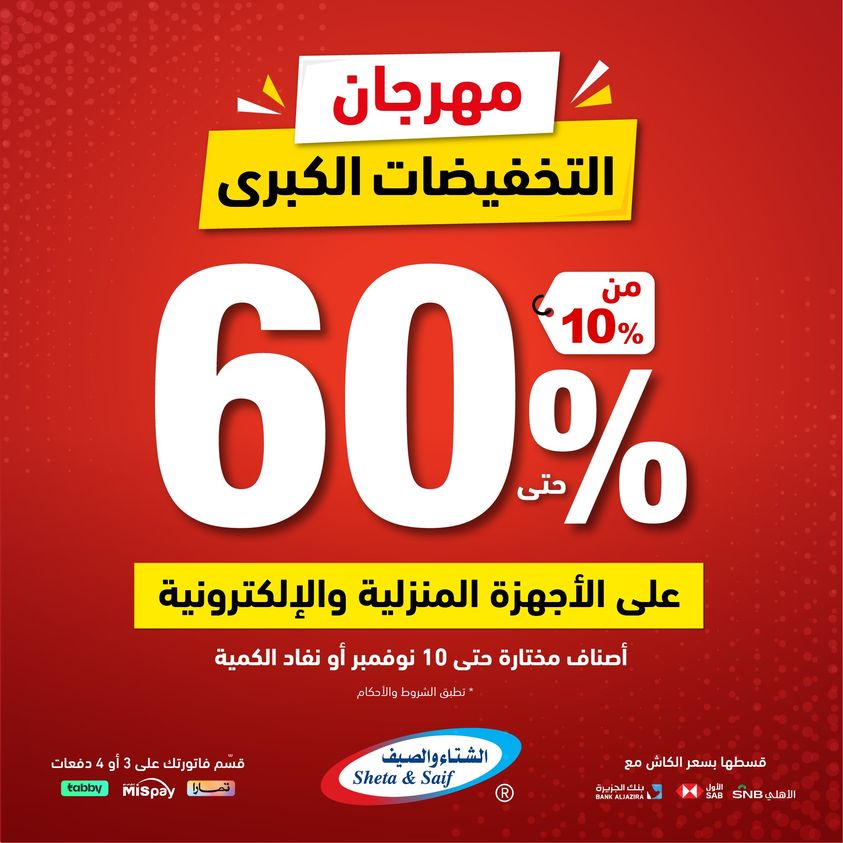 What's new is not to be missed! Double it with the Big Sale Festival with discounts of up to 60% on selected items of home appliances and electronics Visit the nearest branch or order online *Offers are available in their showrooms and online store until November 10 or supplies last عروض الشتاء والصيف للأجهزة المنزلية جديدنا ما يتفوّت! ضاعفها مع مهرجان التخفيضات الكبرى بخصومات تصل 60% على أصناف مختارة من الأجهزة المنزلية والإلكترونية زور أقرب فرع (اضغط هنا) أو اطلب أونلاين (اضغط هنا) * العروض متاحة بمعارضهم والمتجر الإلكتروني حتى 10 نوفمبر أو نفاد الكمية لمتابعة بقية العروض أنتقل للصفحةا لتالية