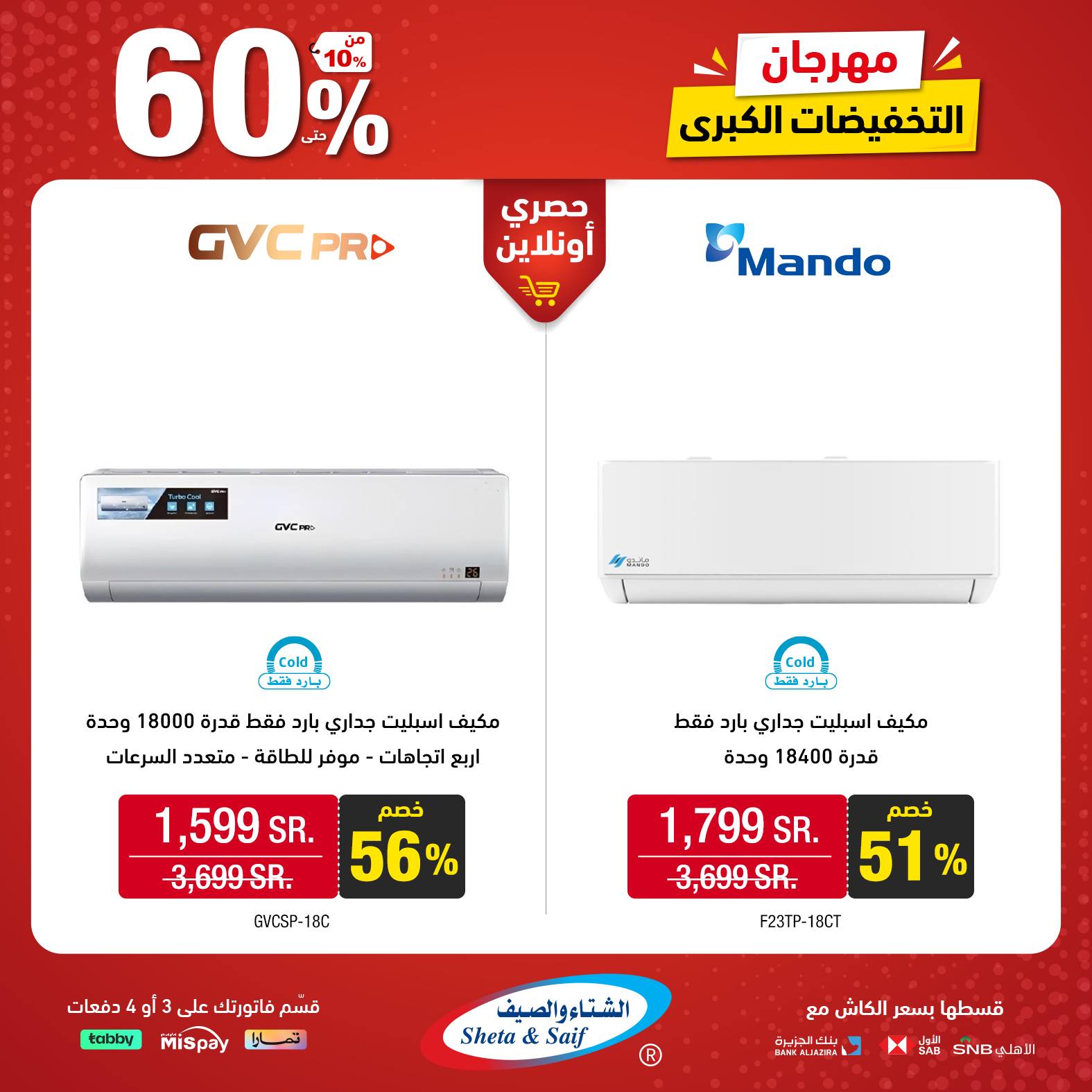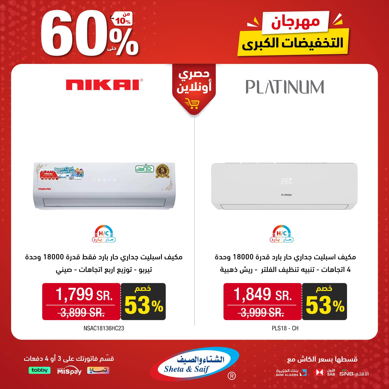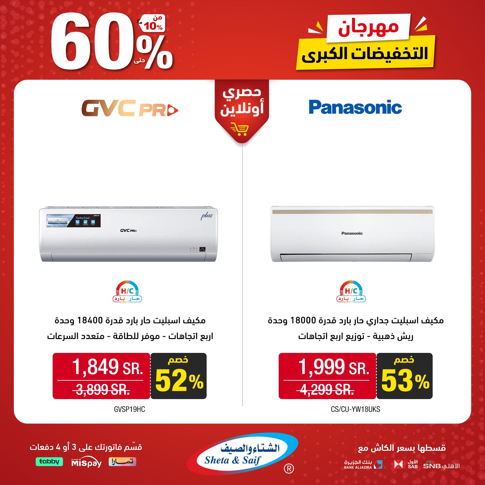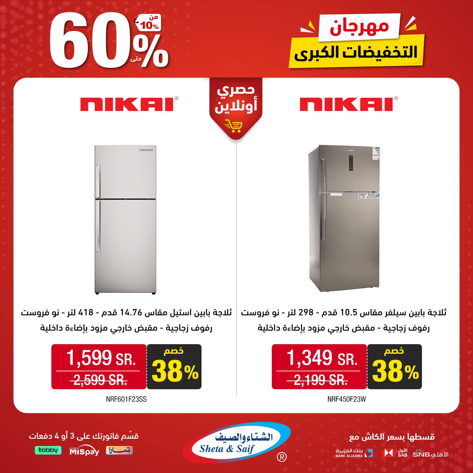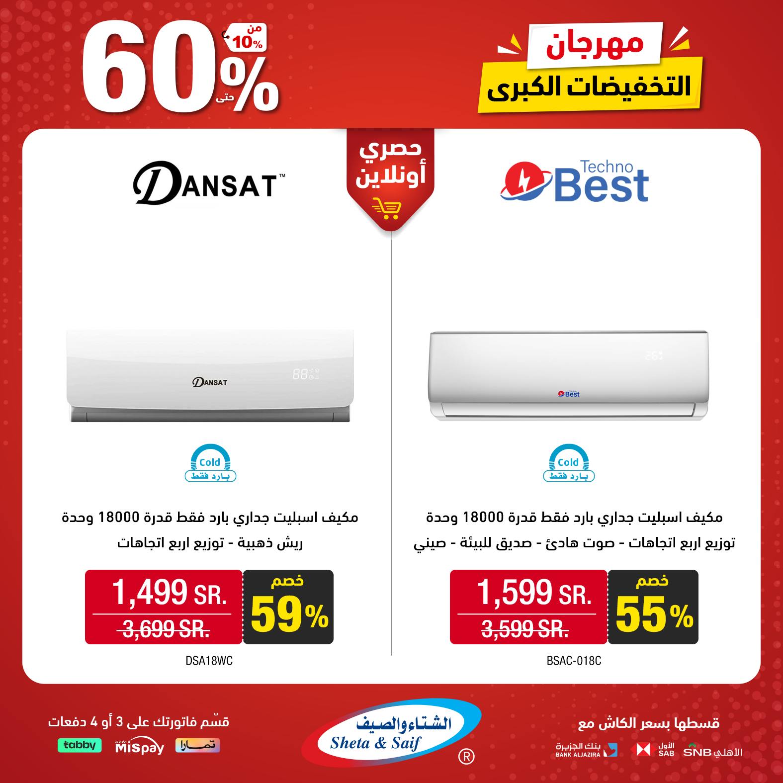 What's new is not to be missed! Double it with the Big Sale Festival with discounts of up to 60% on selected items of home appliances and electronics Visit the nearest branch or order online *Offers are available in their showrooms and online store until November 10 or supplies last عروض الشتاء والصيف للأجهزة المنزلية جديدنا ما يتفوّت! ضاعفها مع مهرجان التخفيضات الكبرى بخصومات تصل 60% على أصناف مختارة من الأجهزة المنزلية والإلكترونية زور أقرب فرع (اضغط هنا) أو اطلب أونلاين (اضغط هنا) * العروض متاحة بمعارضهم والمتجر الإلكتروني حتى 10 نوفمبر أو نفاد الكمية لمتابعة بقية العروض أنتقل للصفحةا لتالية