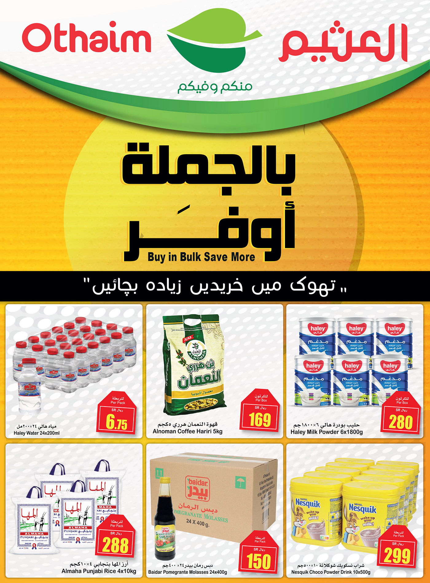 Go to Al-Othaim and get your needs at a wholesale price The offer starts on Wednesday, October 25 and ends on Tuesday, October 31, or until supplies last عروض الجملة من أسواق عبدالله العثيم الجملة توفر عليك.. و كمية رااااااهية تكفيك.. روح للعثيم وخذ احتياجاتك بسعر الجملة يبدأ العرض الأربعاء 25 اكتوبر و ينتهي الثلاثاء 31 اكتوبر او حتى نفاد الكمية لمتابعة بقية العروض أنتقل للصفحةا لتالية