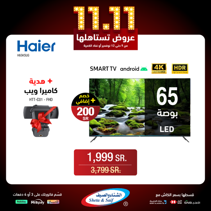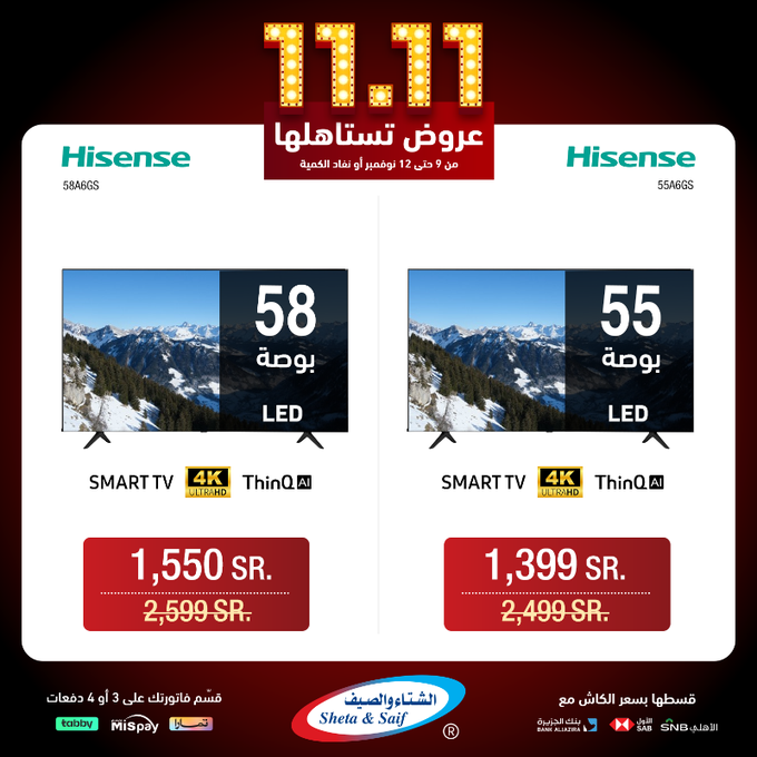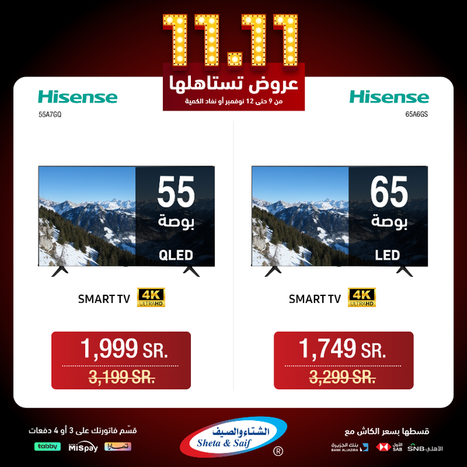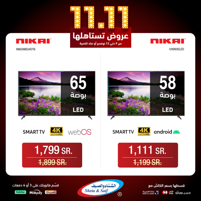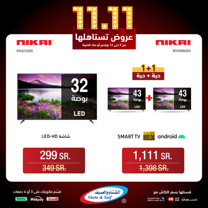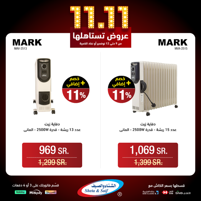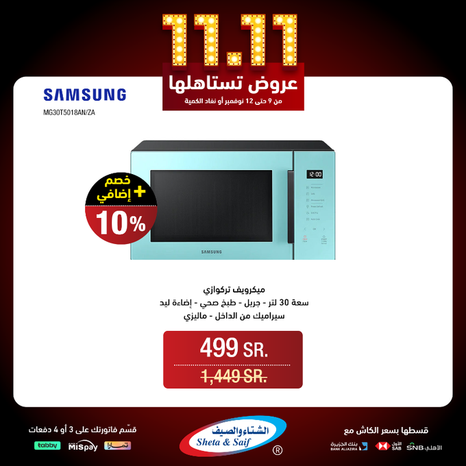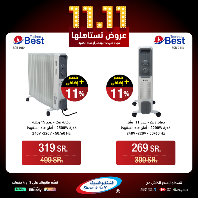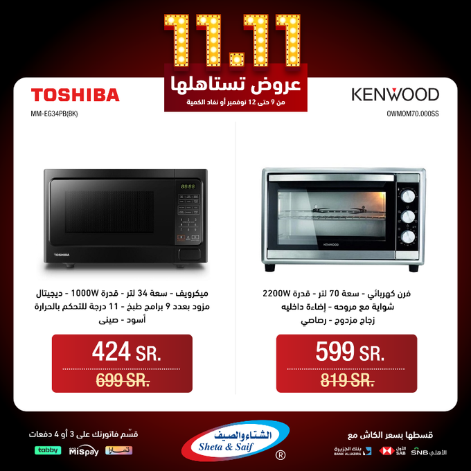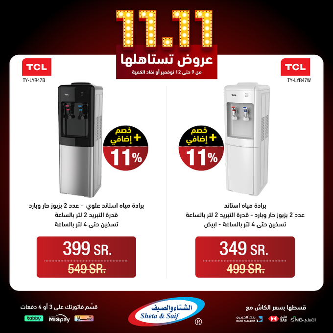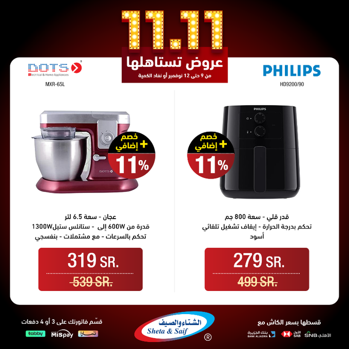 11.11 started with offers you deserve... Shop for home and electronic appliances at special prices and additional 11% discounts on selected items * Offers in their showrooms and online store * Until November 12 or supplies last عروض يوم العزاب من الشتاء والصيف بدأت 11.11 بعروض تستاهلها.. تسوّق الأجهزة المنزلية والإلكترونية بأسعار مميزة وخصومات إضافية %11 على أصناف مختارة زور أقرب فرع (اضغط هنا) * العروض بمعارضهم والمتجر الإلكتروني * حتى 12 نوفمبر أو نفاد الكمية لمتابعة بقية العروض أنتقل للصفحةا لتالية لمتابعة بقية العروض أنتقل للصفحةا لتالية