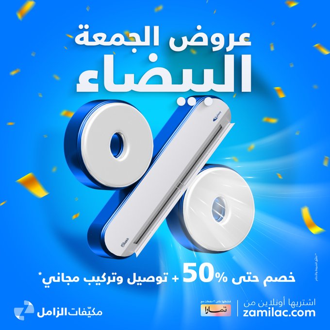 What are you waiting for.. Black Friday offers have arrived! Enjoy discounts of up to 50% on classic air conditioners + free delivery and installation* Shop via the app or website. *Terms and conditions apply عرض الجمعة البيضاء من مكيفات الزامل وش تنتظر.. عروض الجمعة البيضاء وصلت ! استمتع بخصومات تصل الى 50% على مكيفات الكلاسيك + توصيل وتركيب مجاني* تسوق عبر التطبيق أو الموقع الالكتروني .. *تطبق الشروط والاحكام