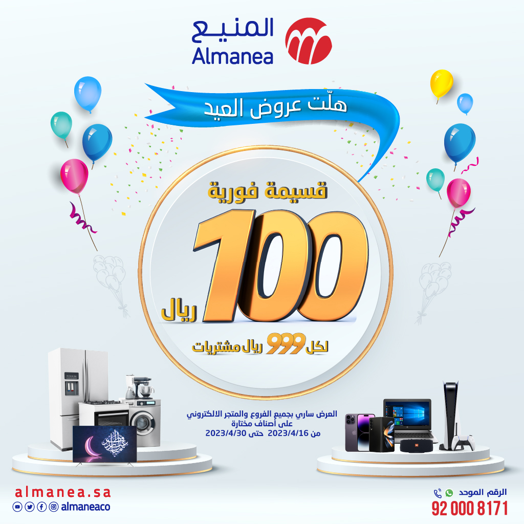 عرض العيد من المنيع للاجهزة المنزلية هلت عروض عيد الفطر من المنيع.. قسيمة فورية 100 ريال لكل 999 ريال مشتريات على أصناف مختارة *العرض ساري حتى 30 أبريل تفضلوا بزيارة أحد الفروع أو المتجر الإلكتروني أو بالاتصال على الرقم الموحد920008171