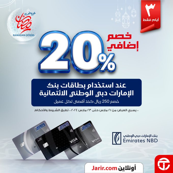 خصم 20% عند تسوّقك في موقع جرير الإلكتروني وتطبيق جرير باستخدام البطاقات الائتمانية من بنك الإمارات دبي الوطني