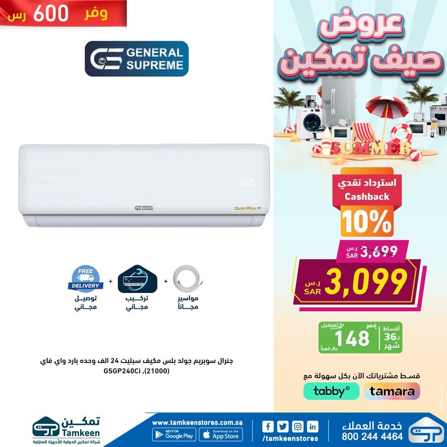احصل على خصم فوري 10 % على مكيف اسبليت 24 الف وحدة بارد جولد بلس من جنرال سوبريم واحصل فوقها على عرض (تركيب – توصيل – انابيب ) مجانا